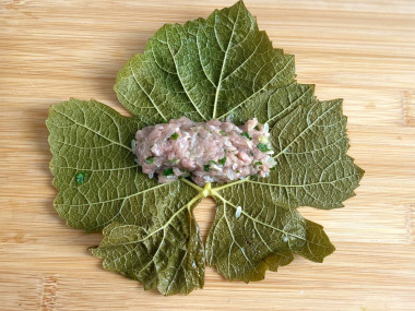 Фарша у меня было немного, готовила на пробу, только для себя. Виноградные листья нарезала свежие, помыла, залила кипятком на 30 минут.