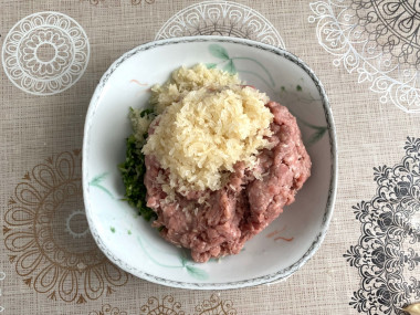 Пропустите оба вида мяса, лук, чеснок, укроп и петрушку через мясорубку.