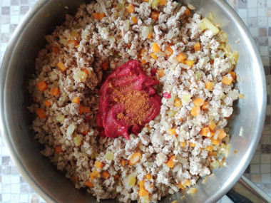 Обжарила овощи, но морковку я решила порезать кружочками, на масле и положила фарш. Следуя совету автора, тщательно разминала фарш лопаткой, чтоб не было комочков. Затем добавила специи и томатную пасту, которую храню в морозилке. Из специй положила сушёный базилик, соль, перец, копчёную молотую паприку, молотый мускатный орех. Долив воды, протушила 10 минут подливу. В конце, как и пишет автор, добавила чеснок. Аромат был восхитительный! Настолько вкусно, что я прям со сковородки и попробовала подливку. Очень вкусно! Мммм...