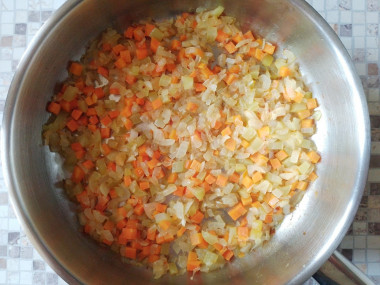 Лук и морковь очистите от кожуры и ополосните от загрязнений. Лук мелко нарежьте, а морковь потрите на крупной терке. На горячую сковороду налейте немного растительного масла и выложите измельченные лук и морковь. Помешивая, обжаривайте их 2-3 минуты на небольшом огне.