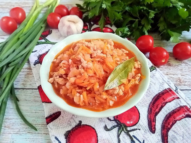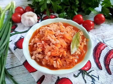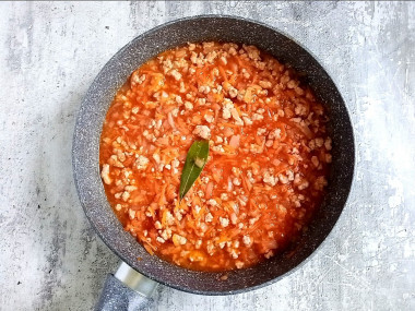 У меня был кусочек свиного карбоната, перекрутила его на мясорубке. На сковороде обжарила лук, нарезанный небольшими кусочками. Морковь у меня замороженная, натертая на крупной тёрке. Овощи немного подержала на сковороде, сдвинула их в сторону. На свободное место выложила фарш, а сковородку сдвинула так, чтобы фарш обжарился. После этого все смешала, добавила специи по вкусу, лавровый лист и один зубчик чеснока для аромата. Томатная паста у меня тоже замороженная, но в горячей воде она быстро разошлась. Тушила подливу минут 20 на маленьком огне. Мясной фарш хорошо пропитался томатом и соком овощей. Получилось очень сочно и вкусно!