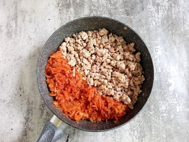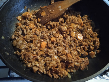 Затем добавьте в сковороду подготовленный фарш. Все перемешайте и обжаривайте все вместе еще 3-5 минут. За время жарки фарш изменит цвет. Чтобы он не был комочками, необходимо их разминать лопаткой.