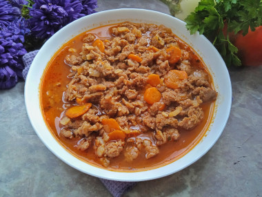 Люблю, когда вкусно и быстро. Именно такой для меня получилась Подлива из фарша томатная на сковороде. Морковь здесь мне захотелось нарезать мелким кубиком для рассыпчатости в готовом блюде. Сейчас сезон перцев, и я добавила их в мелконарезанном виде к зажарке. Это придало дополнительный аромат подливе из мясного фарша. В конце приготовления влила чуть-чуть яблочного уксуса для баланса вкуса. К столу подала с бурым рисом и зеленью. Яркими красками томатов и зелени подлива украсила гарнир. Насыщенному мясному вкусу великолепно аккомпанировали непревзойдённые ароматы овощей и пряностей. Спасибо за крутой рецепт!