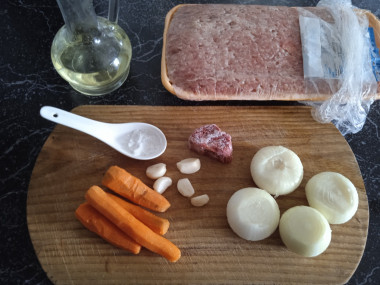 Как сделать томатную подливу из фарша на сковороде? Подготовьте для этого необходимые ингредиенты. Фарш лучше всего приготовить самостоятельно. Можно взять любой вид мяса. Это может быть свинина, говядина, курица, индейка, телятина. Я буду готовить из фарша свинины. Лук и морковь берите среднего размера.