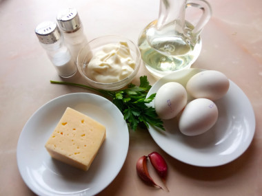 Калорийность продуктов: Яйца, Твёрдый сыр, Майонез, Чеснок, Растительное масло, Петрушка