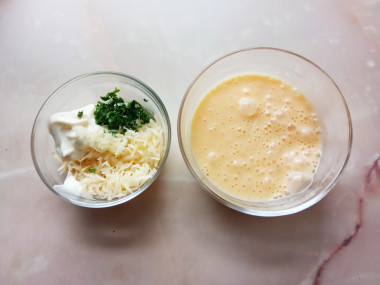 В удобной глубокой чаше соедините яйца с 4 столовыми ложками майонеза. Смешайте до однородности. Для удобства смешивания можно воспользоваться миксером.