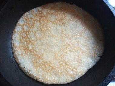 Готовые блинчики снимайте на плоскую тарелку. У меня получилось 3 блинчика размером в 30 см. Для жарки я брала большую сковороду.