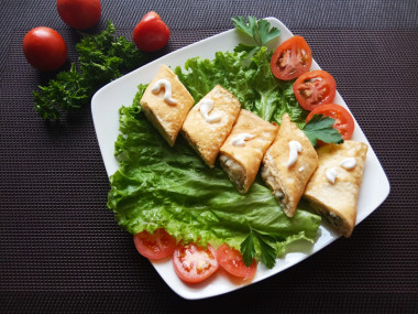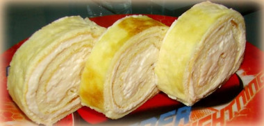 Скрутите блинчик с начинкой в рулет. Так скрутите все блинчики.