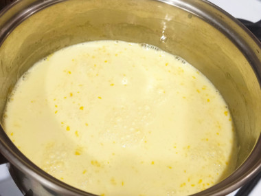 Вылейте получившуюся уже жидкую смесь в сотейник к оставшемуся молоку, перемешайте до однородности.