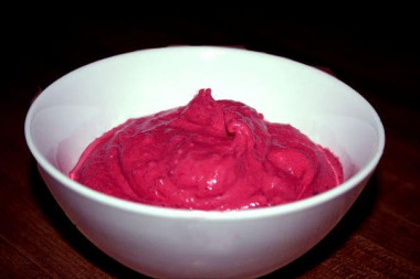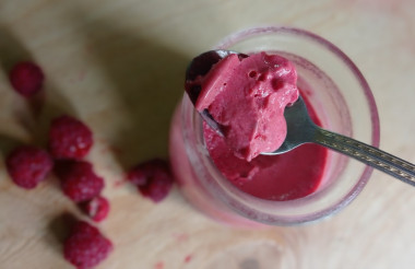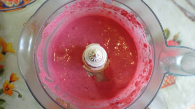 Все ингредиенты я смешала в кухонном комбайне. Смесь получилась яркого и насыщенного розового цвета. Если бы малина была замороженная, то, наверное, консистенция у этой малиново-сливочной смеси была бы близка к констсистенции мороженого.