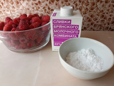 Как сделать домашнее ягодное мороженое? Очень просто и быстро. Для начала подготовьте необходимые ингредиенты по списку. Сливки нужны жирностью 33-35%, подходящие для взбивания. Ягоды можете использовать любые, свежие или замороженные. У меня свежая малина.