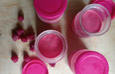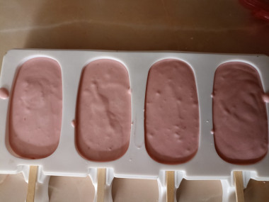 Розовую смесь я разлила по баночкам от йогуртницы и убрала в морозилку на два часа.