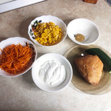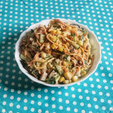 В салате копчёная курица,корейская морковь и кукуруза сочетание ингредиентов просто идеальное! Острота моркови, аромат огурца, нежность курочки и сметанный соус делают салат сочным и очень вкусным! Я ещё добавила немного зелени укропа. Т.к. ингредиенты все готовые,салат готовится быстро!