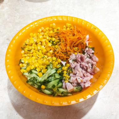 Сложите в салатник нарезанные курицу и огурец. Корейскую морковь, если она длинная, порубите ножом или нарежьте ножницами прямо в салатник. Добавьте кукурузу. При желании можете также добавить любую свежую зелень по вкусу.