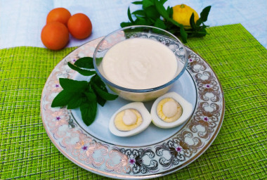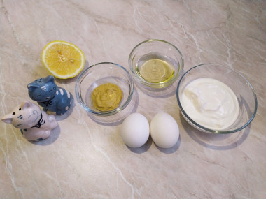Как сделать домашний диетический майонез? Подготовьте продукты. Яйца заранее отварите и остудите. Сметана подойдет любой жирности, учитывайте только, что чем она больше, тем калорийнее получится соус. Горчицу возьмите в первую очередь вкусную, слишком острую я бы не советовала брать. Масло у меня оливковое, но подойдет любое растительное, опять же, выбирайте на свой вкус.