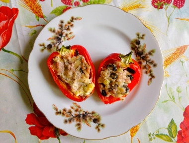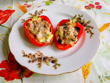 Поскольку я готовила такие перцы на ужин, а мой муж не признаëт ужин без мяса, то в начинку ко всем остальным ингредиентам я добавила свиной фарш. Маслины у меня были уже нарезанные на кружочки. Свежий чеснок заменила чесночным порошком. Поскольку я добавила мясо в начинку, то запекала перцы в духовке подольше, 35 минут.