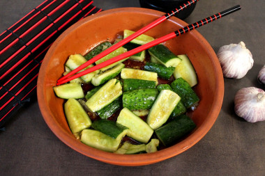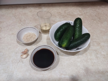 Как сделать быстрые огурцы в соевом соусе по-корейски? Подготовьте для этого необходимые ингредиенты. Количество ингредиентов и их пропорции даны приблизительные. Любители соевого соуса могут взять его гораздо больше, но учитывайте, что он соленый. По желанию даже можно добавить немного специи. Например, молотый перец. Это сделает огурцы более острые.