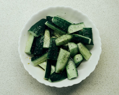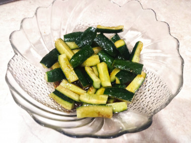 Полейте огурцы соевым соусом и растительным маслом. Если соевого соуса покажется маловато, то огурцы можно немного подсолить.