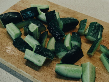 Подготовленные огурцы хорошо помойте от загрязнений и разрежьте на кусочки. Каждый кусочек разрежьте напополам, чтобы была видна сердцевина огурцов.