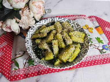 Добавила к огурчикам и хорошо перемешала. Дала постоять 5 минут и выложила в тарелку. Сверху посыпала кунжутом.