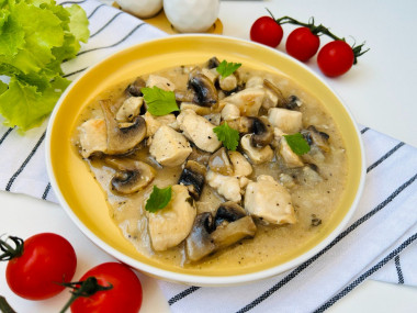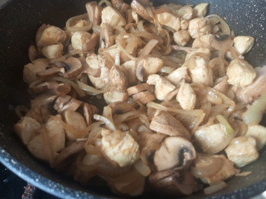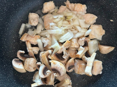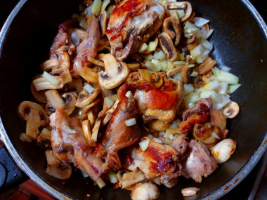 Выложите грибы с луком в сковороду к мясу. Все перемешайте. Обжарьте все вместе еще 2-3 минуты. Затем подлейте немного горячей воды и накройте сковороду крышкой. Тушите куриное мясо с грибами минут 15-20.
