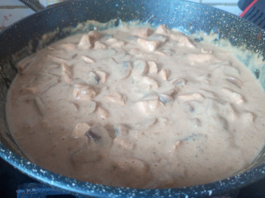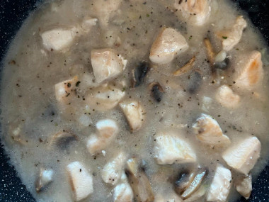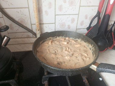 Обнаружил сегодня в холодильнике отварные макароны, но так как пустые макарошки как-то не ал-ле, решил сделать к ним какую нибудь вкуснятину. Вот наткнулся на этот рецепт) Куриное филе порезал небольшими кубиками, лук- полукольцами, грибы были уже нарезаные пластинами и заморожены. Сначала обжарил лук около трех минут. Присолил его и добавил немного куркумы. Следом закинул филешки и обжаривал постоянно перемешивая пять минут. Далее добавил грибы и готовил еще пять минут. Добавил специи, соль, 200мл горячей воды, закрыл крышкой и протушил 20 минут на тихом огне. Пока все это тушилось сделал соус. Тут я отошёл от рецепта и развел муку в 200мл сливок 10процентеых, плюс добавил немного мускатного ореха. Залил соус в сковороду, перемешал, но так как все получилось слишком густое добавил еще 200 мл горячей воды. Опять все перемешал, довел по вкусу по соли и перцу. Довел до кипения и выключил. Оставил под крышкой достаиватся) Подливой остался доволен и по вкусу и по легкости приготовления. Спасибо автору за вкусный и легкий рецепт. Всем рекомендую, а рецепт записываю в свою кулинарную книгу)