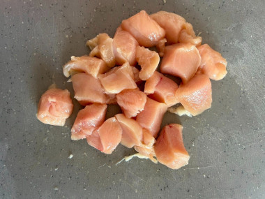 Мясо грудки нарежьте на кусочки, примерно одного размера. Курицу можете заменить на индейку или на любой другой вид мяса по вашему желанию.