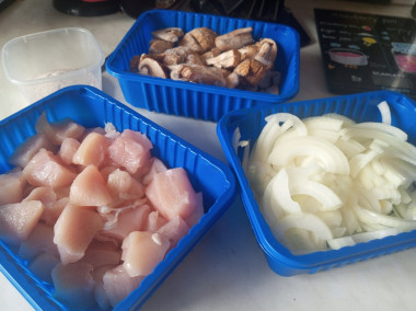 Пока курица жарится подготовьте грибы и лук. Шампиньоны промойте от загрязнений и разрежьте на 2-4 части. У меня грибочки небольшого размера, поэтому я их разрезаю только напополам. Лук очистите от шелухи, ополосните в холодной воде и мелко нарежьте. Вместо шампиньонов можно взять любые другие грибы.