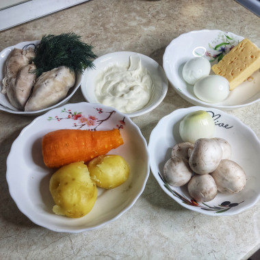 Захотелось попробовать что-то новое, мне понравилась идея слоёного салата с курицей и грибами и решила приготовить. Мясо я использовала отварное. Готовится слоёный салат с курицей и грибами совсем несложно: пока отваривала мясо и овощи, обжарила грибы с луком. По совету автора использовала майонез и сметану. Действительно,так получилось нежнее и вкуснее! Готовила порционно в формочке.