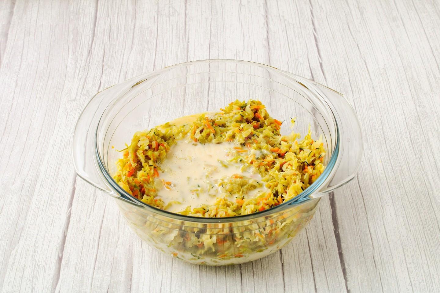 Подготовьте необходимые продукты. Выбирайте молодые кабачки с нежной кожицей. Если используете более зрелые кабачки, срежьте грубую кожуру и вырежьте серединку с семенами. Овощи вымойте под проточной водой. Зелень помойте и обсушите. Морковь и кабачок натрите на крупной терке. Репчатый лук нарежьте мелкими кубиками. Капусту нашинкуйте тонкой соломкой. Зелень мелко нарежьте. Помидоры черри разрежьте пополам. Заранее разогрейте духовку до 180 ℃.