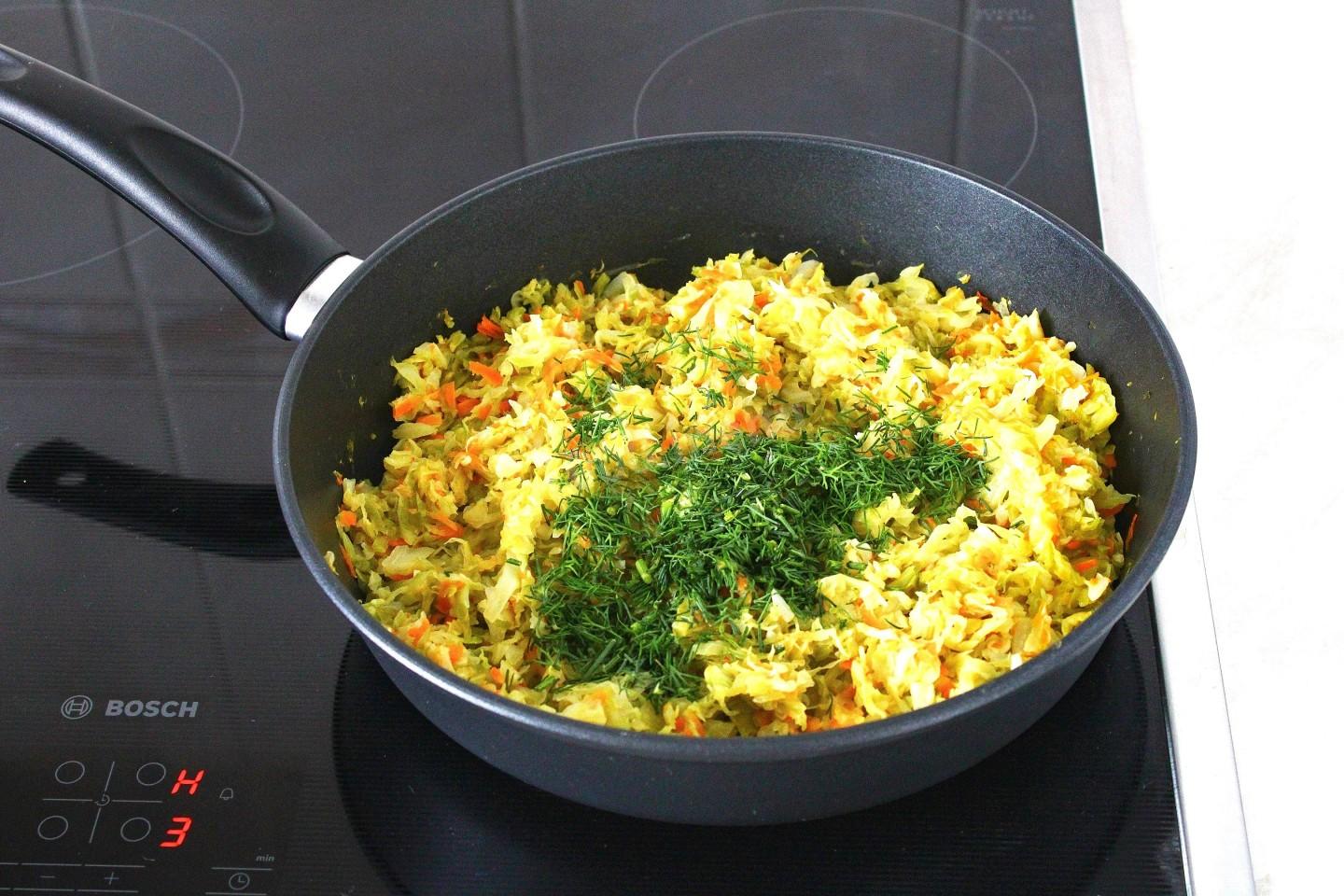 На разогретой сковороде с маслом обжарьте лук до прозрачности около 3 минут. Добавьте морковь, готовьте примерно 5 мин. Введите кабачки и капусту, тушите под крышкой около 10 мин до мягкости. В конце добавьте укроп, соль и перец. Можно использовать любые приправы по вкусу и желанию. Потомите овощи примерно еще 1-2 минуты и снимите с плиты. Тушеные овощи остудите. Как выбрать сковороду и растительное масло читайте под описанием рецепта по ссылкам.