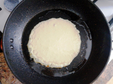 Разогрейте на сильном огне сковороду, лучше, если она будет блинной - с толстым дном и антипригарным покрытием. Смажьте ее растительным маслом. Вылейте половину половника теста, круговыми движениями распределите его по всему дну. Если тесто у вас правильной консистенции, то его уйдет совсем немного, и блин получится тонким. Как выбрать подходящую сковороду читайте в статье под описанием рецепта по ссылке.