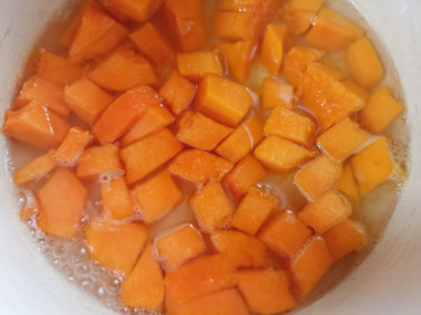 Тыкву очистите от кожуры и семян и нарежьте небольшими кусочками. Так она быстрее приготовится. Учтите, что точное время зависит от сорта тыквы.