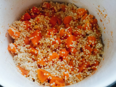 Всыпьте к тыкве промытое пшено и перемешайте. Варите, периодически помешивая, примерно 10 минут.