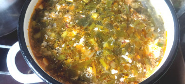 После того, как бульон был готов, положила в кастрюлю картофель. Пропассеровала лук с морковью и, минут через двадцать после закипания бульона с картофелем, отправила в кастрюлю. После этого отправила в кастрюлю порезанный щавель, несколько порезанных перьев зелёного лука и укроп. Посолила и поперчила, добавила немного сванской соли (по желанию) и порезанные кубиками яйца. Все, мой зелёный борщик готов.
