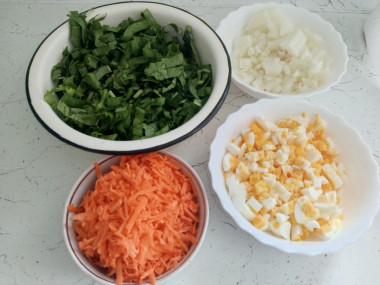 Яйца сварила заранее. С начала закипания - 9 минут. Этого достаточно, чтобы яйца не переварились, но и не были жидкими. Картофель порезала крупными кубиками, лук порезала мелкиими кубиками, морковь натерла на крупной терке.