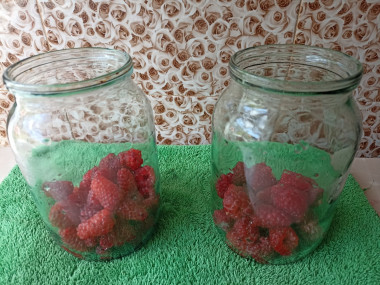 В подготовленные банки разложите ягоды малины. У меня попалось несколько желтых ягодок.