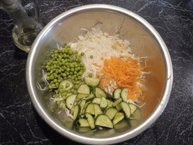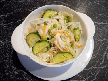 Салат с капустой, горошком и огурцами готов! Переложите его в салатник подходящего размера и подавайте к столу. Свежий овощной салат отлично подойдет для мясных блюд. Приятного аппетита!