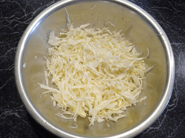 Капусты тонки нашинкуйте и немного помните руками, чтобы она стала мягче и быстрее пустил сок. Нарезанную капусту переложите в просторную миску.