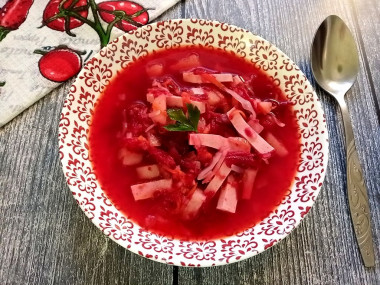 Мне понравилось, что этот борщ готовится очень быстро. А по вкусу не уступает своим собратьям. Он лёгкий, вкусный, сытный. Колбаска приобрела сладковатый привкус благодаря свекле. Нам приглянулся этот рецепт, теперь попробую добавить сардельки или готовый карбонат.