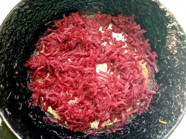 Свеклу натрите на крупной терке и обжаривайте 5-7 минут. За время жарки свекла немного уменьшится в размере.