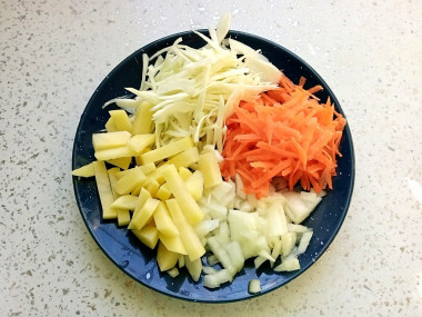 Капуту тонко нашинкуйте. Лук мелко нарежьте. Морковь натрите на крупной терке. Капусту отправьте в кастрюлю к картофелю и варите все вместе еще минут 10-15.