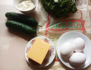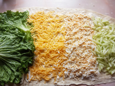 Визуально разделите лаваш на 4 равные части. На первую четверть распределите тертые яйца. На вторую выложите листья салата. Далее выложите тертый сыр. На последнюю часть распределите огурцы.
