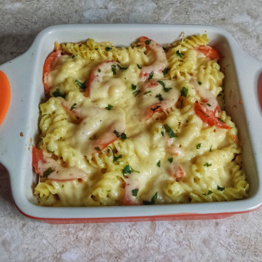 В форму, смазанную маслом,выложила слоями макароны, помидоры,сыр. Сверху немного посыпала измельченной зеленью петрушки.Запекала при 180° 20 минут. Так просто,сытно,аппетитно и очень вкусно!
