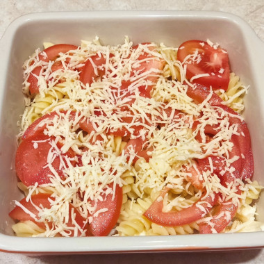 Макароны предварительно отварила, помидоры порезала тонкими полукольцами, сыр натерла на мелкой тёрке.