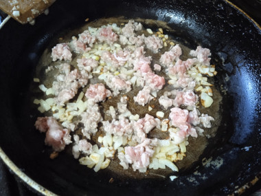 Затем добавьте подготовленный фарш и перемешайте его с луком. Обжаривайте все вместе около 7-8 минут на среднем огне. Фарш посыпьте соль и специями. Специи выбирайте на свой вкус. Я добавила немного молотых перцев и паприку. Фарш должен полностью изменить цвет и начать поджариваться.