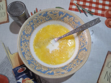 В отдельной чаше смешайте яйцо с молоком. Немного специй я добавила еще к яйцам. Все смешайте. Для смешивания удобно воспользоваться венчиком.