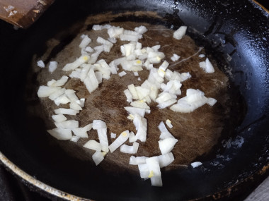 Лук очистите от шелухи и ополосните в холодной воде. Затем очищенный лук мелко нарежьте. Сковороду для жарки разогрейте до горячего состояния и налейте немного растительного масла. Выложите нарезанный лук и обжаривайте его в течение минуты до прозрачности.