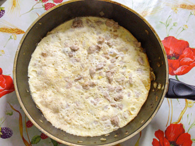 Яичной смесью залейте обжаренный фарш. Накройте сковороду крышкой и готовьте на небольшом огне до готовности. На приготовление уйдет 5-8 минут.