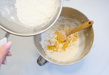Всыпьте просеянную с разрыхлителем муку. Советую всю муку сразу не добавлять. Почему нужно так сделать? Чтобы тесто не получилось слишком плотным и крутым. Такое тесто будет плохо подниматься, а печенье получится твердоватым. Лучше подсыпать оставшуюся муку в процессе замешивания теста по мере необходимости. О муке и её свойствах подробнее можно прочитать в отдельной статье, ссылка в конце рецепта.